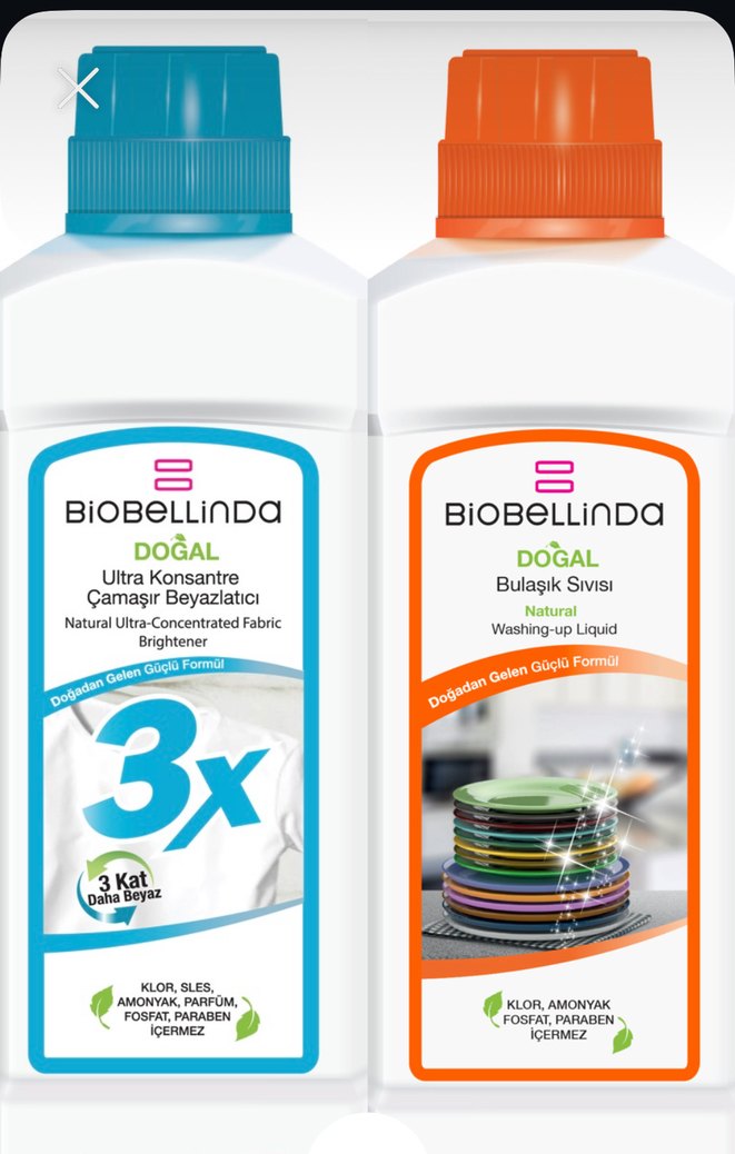 Biobellinda doğal ultra konsantre çamaşır beyazlatıcı ve bulaşık sıvısı. Klor, amonyak, fosfat ve paraben içermez. Beyazlatmada 3 kat güç sağlar