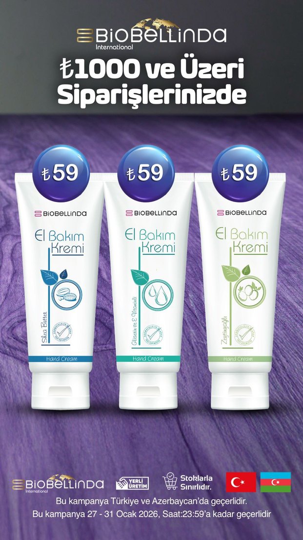 Biobellinda el bakım kremleri, nemlendirici ve besleyici özelliklerle üç farklı çeşitte, her biri 59₺.