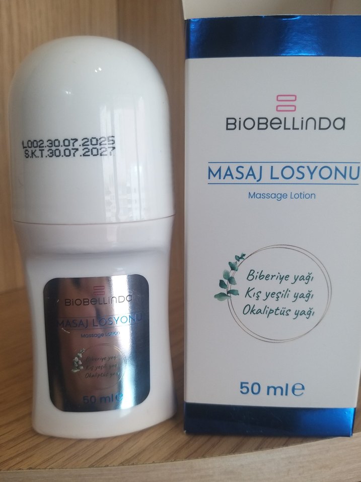 BiOBELLINDA masaj losyonu, biberiye, kış yeşili ve okaliptüs yağları içerir. 50 ml roll-on şişede rahat uygulama sağlar.
