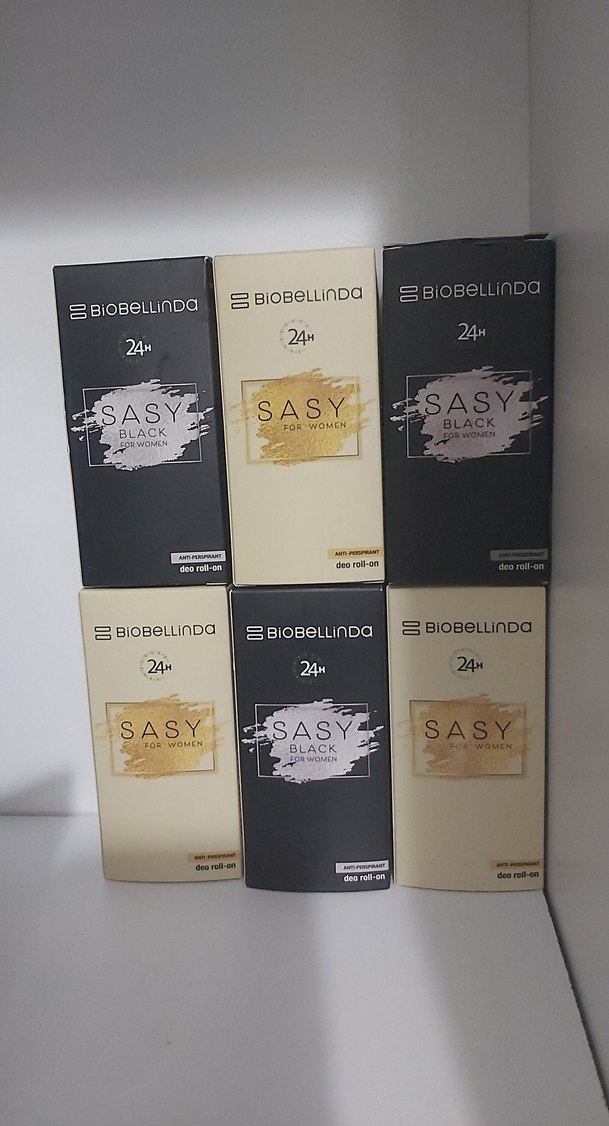 Biobellinda Sasy kadın parfümü, 24 saat kalıcı koku sunar. Siyah ve altın renkli kutularda, antiperspirant deo roll-on formundadır.