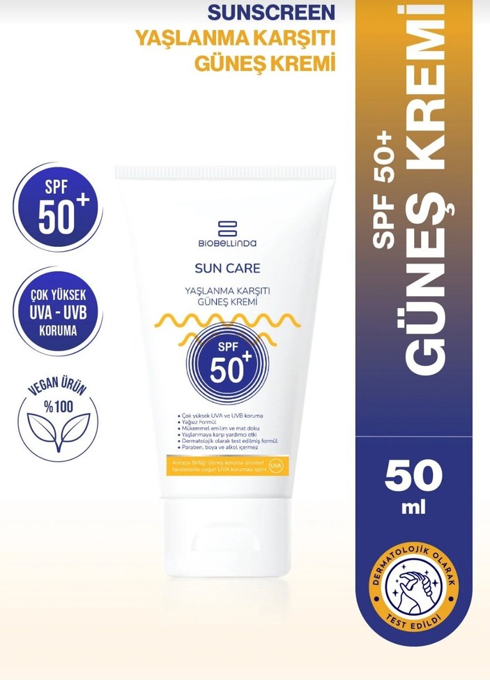 Biobellinda güneş kremi, UVA ve UVB ışınlarına karşı SPF 50+ koruma sağlar ve yaşlanma karşıtı etki sunar. %100 vegan ve dermatolojik olarak test edilmiştir. 50 ml tüpte.