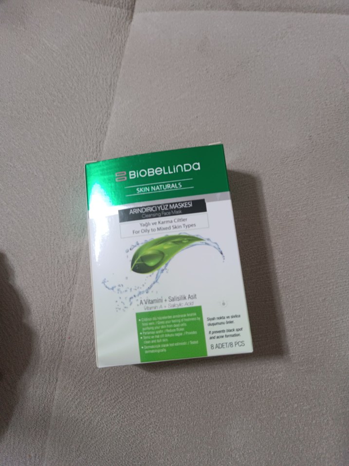BioBellinda Yeşil Arındırıcı Maske, A Vitamini ve Salisilik Asit içerir. Yağlı ve karma ciltler için uygundur. 8 adetlik pakette sunulur.