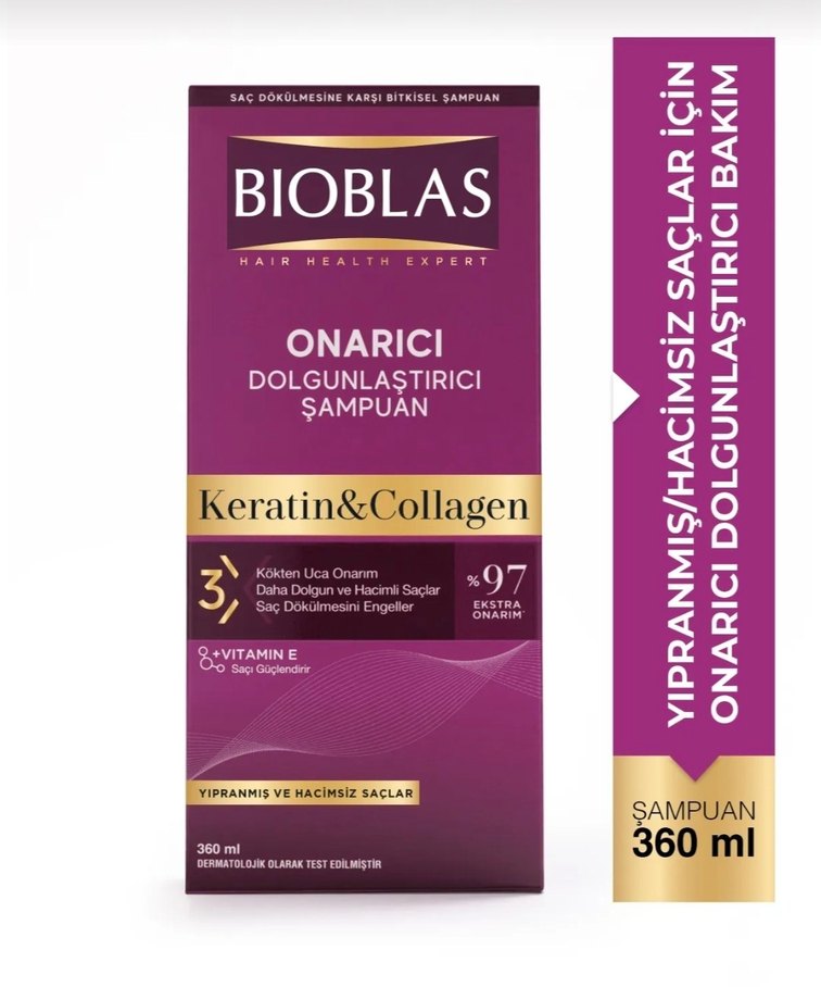 Bioblas Keratin & Kolajen şampuan, vitamin E ile saçları güçlendirir, yıpranmış ve hacimsiz saçları onarır, saç dökülmesini engellemeye yardımcı olur. 360 ml.