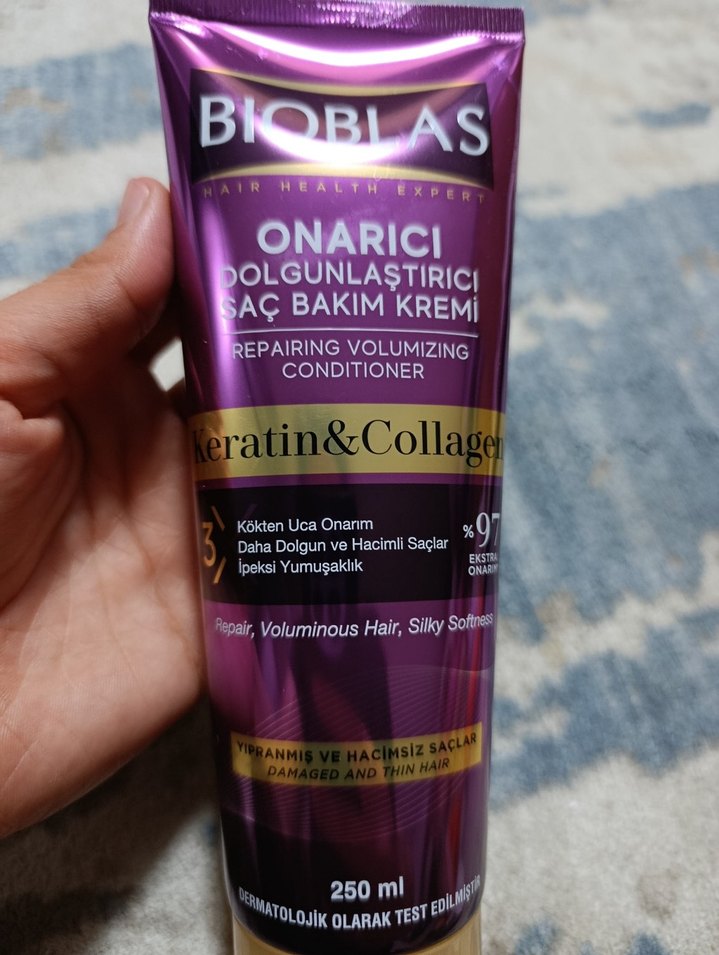 Bioblas Keratin & Collagen içeren onarıcı ve dolgunlaştırıcı saç bakım kremi, kökten uca onarım sağlar, saçları daha dolgun ve yumuşak yapar. Dermatolojik olarak test edilmiştir. ♀️