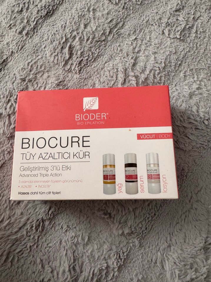 Bioder Biocure vücut tüy azaltıcı kür, gelişmiş 3'lü etki formülü ile hassas dahil tüm cilt tiplerine uygundur. Yağ, serum ve losyon içerir. İçlerind egörüldüğü kadar var