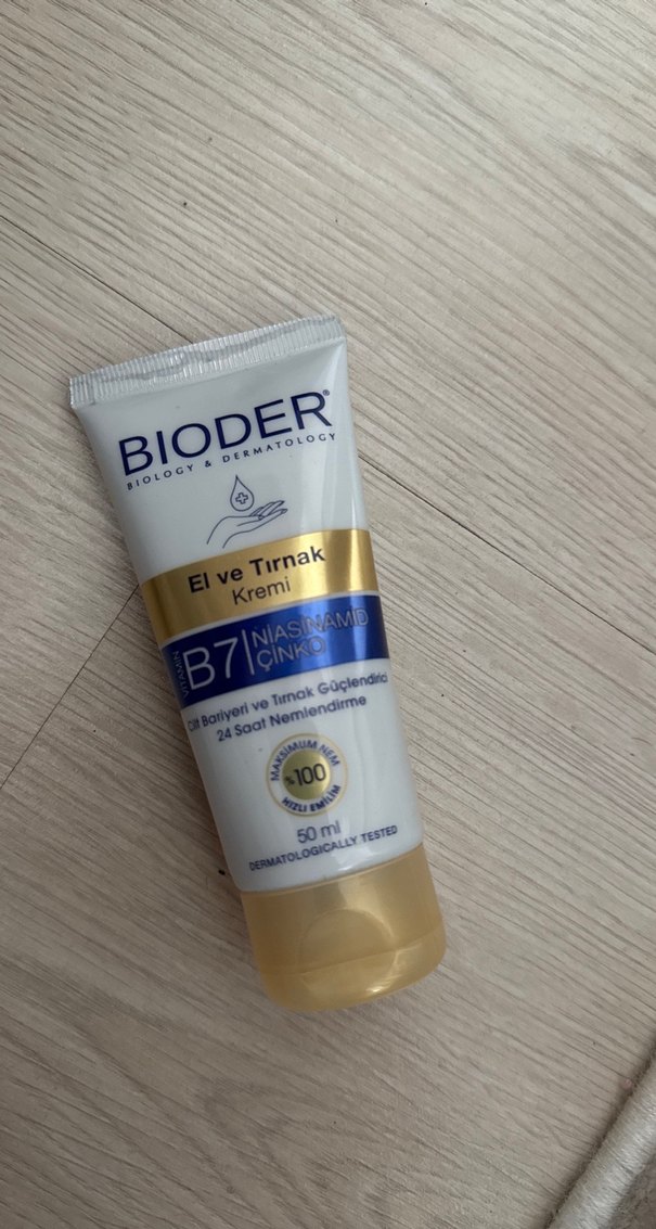 Bioder el ve tırnak kremi, B7 ve niasinamid içeriğiyle 24 saat nemlendirme ve güçlendirme sağlar. Dermatolojik olarak test edilmiştir.