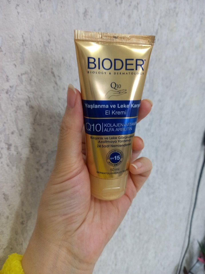 Bioder Q10 el kremi, kolajen, A vitamini ve alfa arbutin içerir. Yaşlanma ve lekelere karşı korur, 24 saat nemlendirir, SPF 15 koruması sağlar.