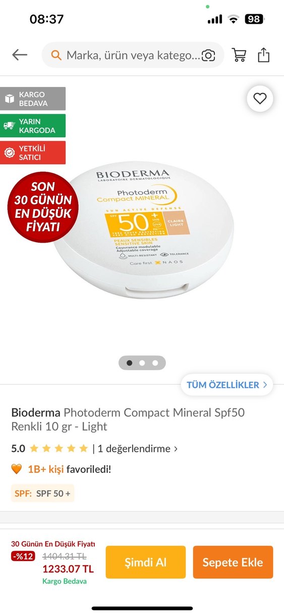 Bioderma Photoderm Compact Mineral SPF50, 10 gr renkli kompakt formda yüksek güneş koruması sağlar. Hafif kapatıcılı ve hassas ciltler için uygundur. 1 kere denedim uanlış rengi almışım