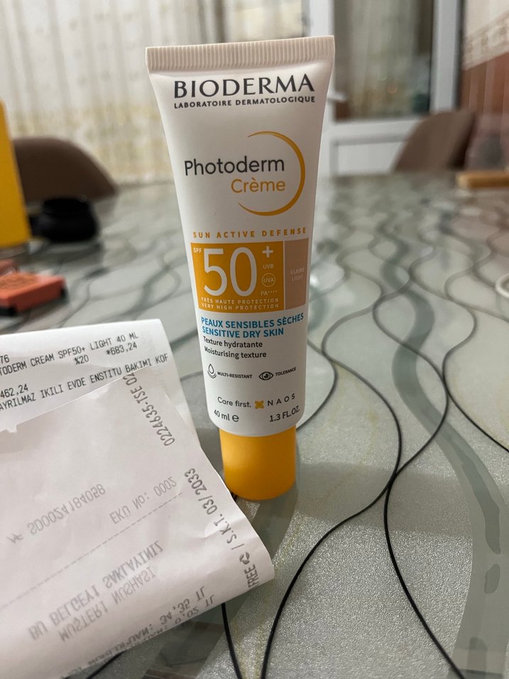 Açık renk tonlu Bioderma Photoderm SPF 50+ krem, hassas ve kuru ciltler için nemlendirici dokuda yüksek güneş koruması sağlar. Aktif güneş savunması sunar. bir defa rengine bakmak icin sıktım hic kullanilmadi..