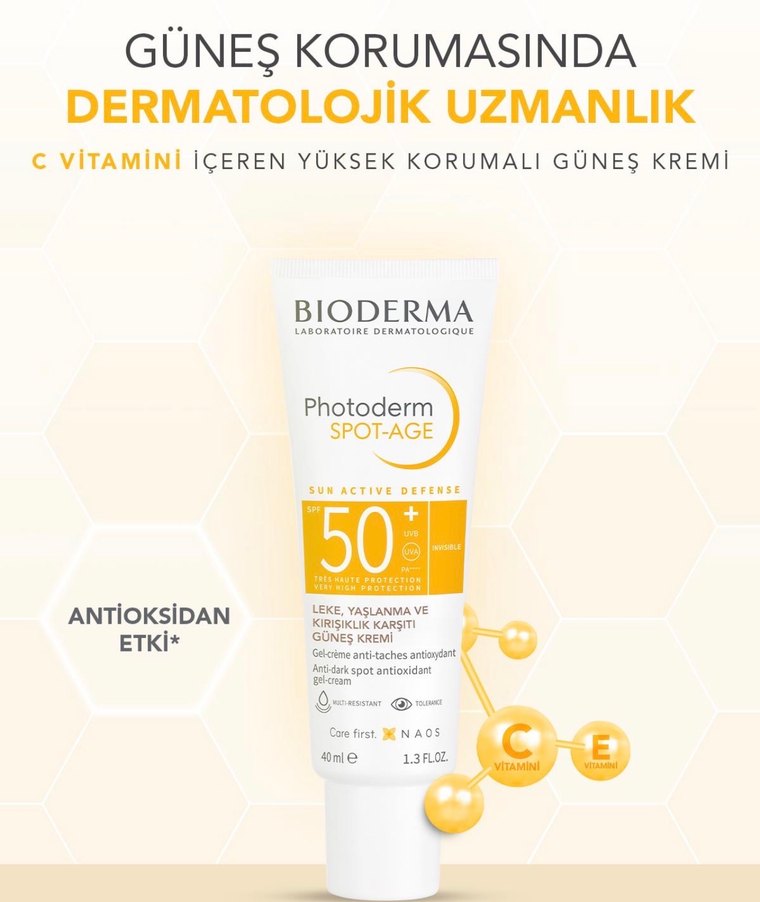 Bioderma Photoderm Spot-Age SPF 50+ güneş kremi, yüksek koruma sağlar ve antioksidan vitaminler içererek leke, yaşlanma ve kırışıklıklara karşı etkilidir.