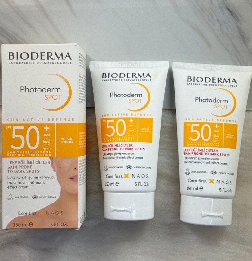 Bioderma Photoderm Spot SPF 50+ güneş koruyucu krem, lekeli ciltler için koyu lekeleri önlemeye ve azaltmaya yardımcıdır. 150 ml tüpte yüksek UVA ve UVB koruması sağlar. ☀️