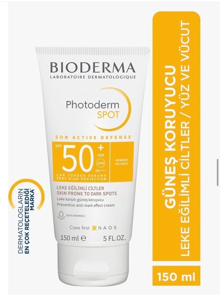 Bioderma Photoderm Spot SPF 50, leke eğilimli ciltler için yüz ve vücutta çok yüksek koruma sağlar. Renk vermeyen, suya dayanıklı 150 ml kremdir. ☀️ sıfır orjınal evzane ürünüdür