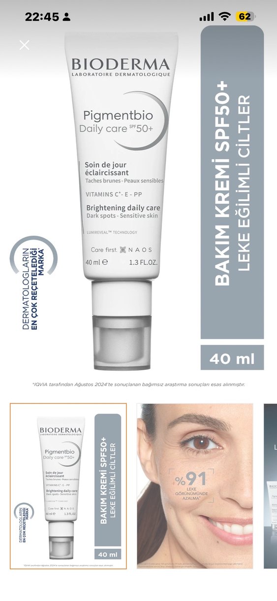Bioderma Pigmentbio BB krem SPF 50+ koruma sağlar, koyu lekeler ve hassas ciltler için aydınlatıcı bakım sunar. C, E ve PP vitaminleri içerir. Hiç kullanılmadı kutusuyla duruyor çok iyi bi ürün hem güneş kremi hem nemlendirici olarak kullanıyorum 2 kutum var bu fazla olduğu için satıyorum