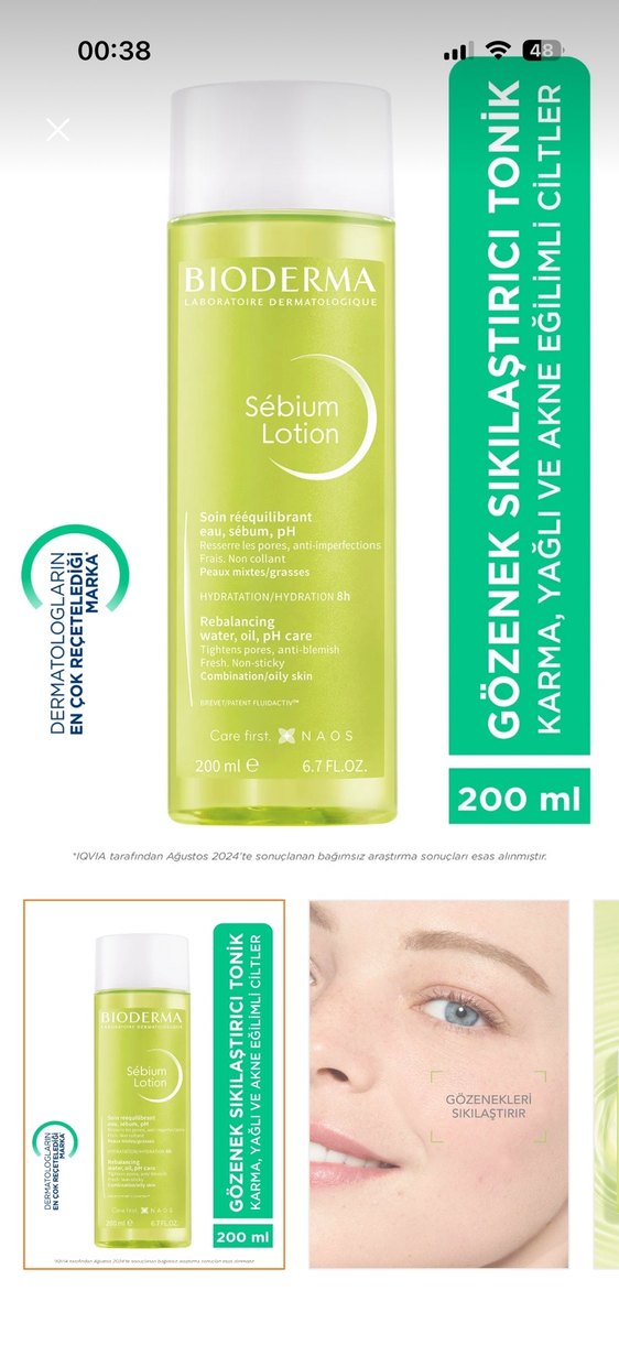 Bioderma Sébium Lotion 200 ml, gözenek sıkılaştırıcı, siyah nokta karşıtı, 8 saat nemlendiren, alkol içermeyen tonik. Göründüğü kadar kullanıldı. Güncel fiyatı 700 TL.