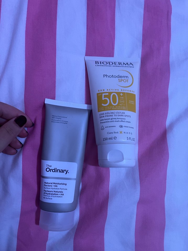 Ürünler cildime uymadı Bioderma Photoderm Spot SPF 50 yüksek koruma sağlar ve leke görünümünü azaltmaya yardımcı olur. The Ordinary Nemlendirici, doğal nemlendiricilerle yüzeyde nem sağlar. Her ikisi de 150ml tüpte sunulur. ☀️
