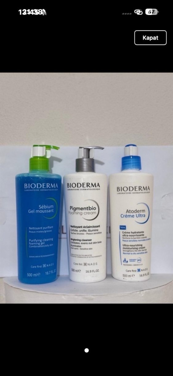 Bioderma yüz temizleyici seti; Sebium arındırıcı jel, Pigmentbio aydınlatıcı köpük krem ve Atoderm ultra besleyici krem içerir, her biri 500 ml.