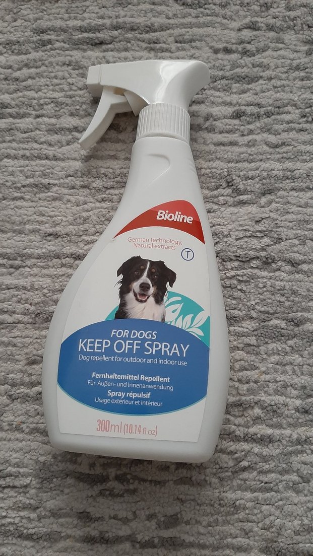 Bioline Köpek Kovucu Sprey, doğal özler ve Alman teknolojisi ile üretilmiş, iç ve dış mekanda kullanıma uygun 300ml sprey.