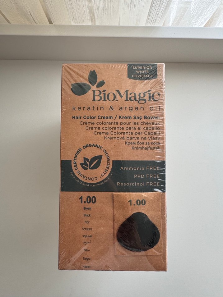 BioMagic siyah saç boyası 1.00, keratin ve argan yağı içerir. Amonyak, PPD ve rezorsinol içermez, sertifikalı organik bileşenlerle güvenli renk verme sağlar. Toplamda elimde 7 adet var (bir adet fiyatı)
