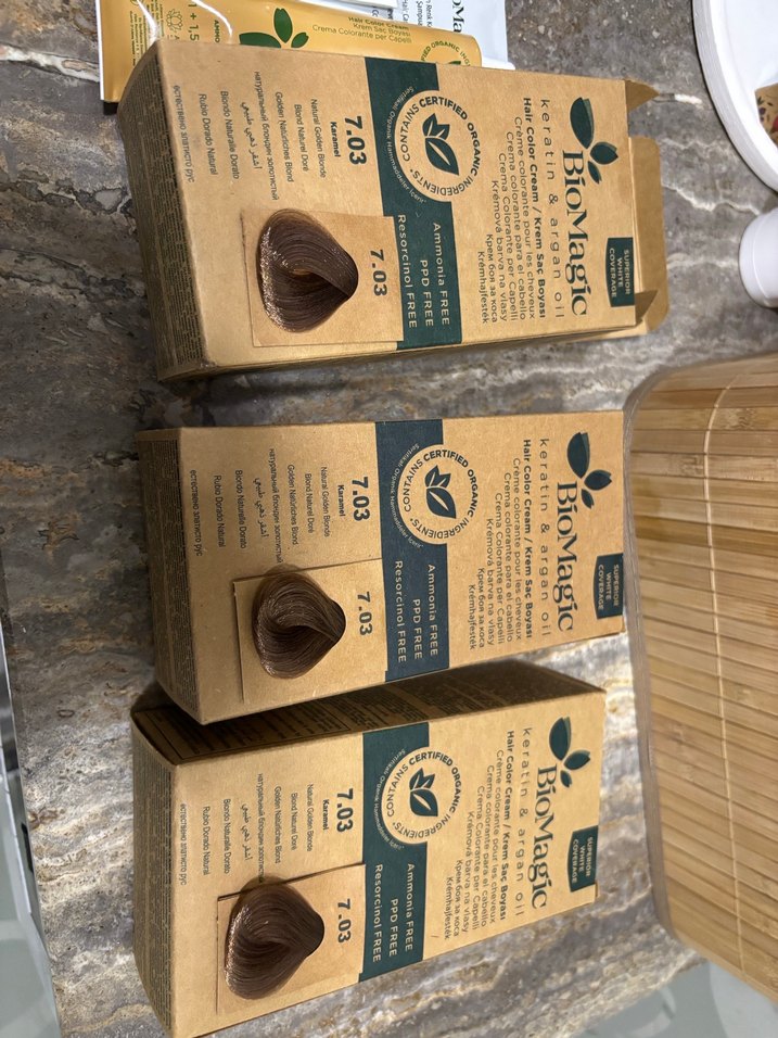 BioMagic saç boyası 7.03 numaralı karamel renginde, organik sertifikalı içerik ve argan yağı ile saç bakımını destekler. Aldım ama kullanmadım gebeyim ancak doktor gebelikte de boyatma dedi cesaret edemedim tanesi 250
