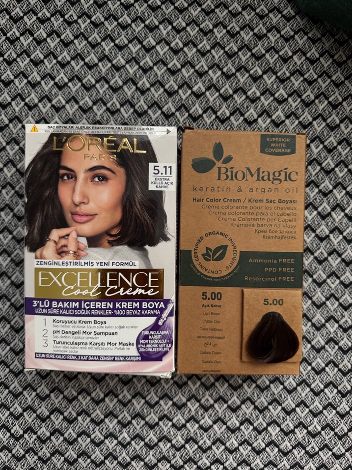 BioMagic keratin ve argan yağlı 5.00 ve L'Oreal Excellence 5.11 krem saç boyası içerir. Bio Magic 299