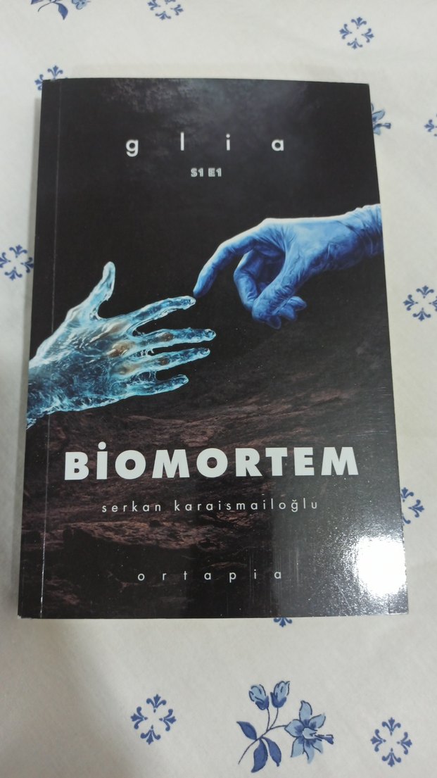 Serkan Karaismailoğlu'nun Biomortem kitabı, karanlık ve bilimsel bir hikaye sunuyor. Kapakta iki elin uzanması bağlantı ve gizemi simgeliyor.