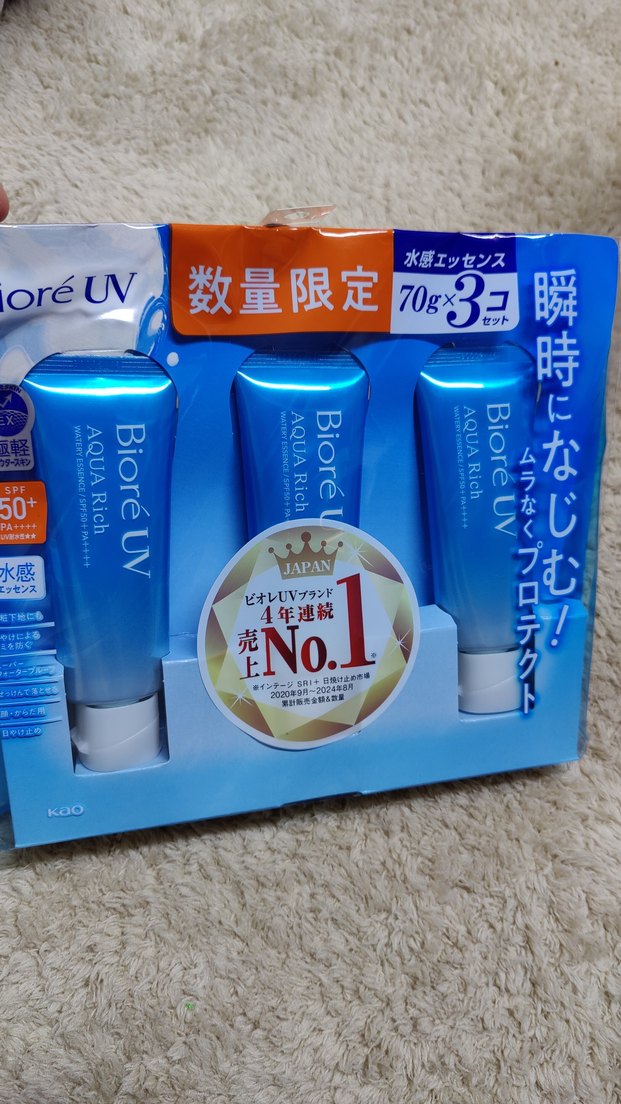 Bioré UV Aqua Rich, SPF 50+ koruma sağlayan, nemlendirici formüle sahip güneş koruyucu. 70g'lık 3 tüp içeren set, etkili güneş bakımı sunar.