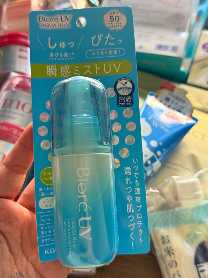 Biore UV Aqua Rich SPF 50 güneş koruyucu mist, hafif ve hızlı emilen yapısıyla cildi nemli ve korunaklı tutar. Su bazlı ferahlatıcı formül içerir. ☀️ Saç dahil vücudunuzun her yerine kullanabilirsiniz. Japonya’da en çok satan güneş ürünüdür.