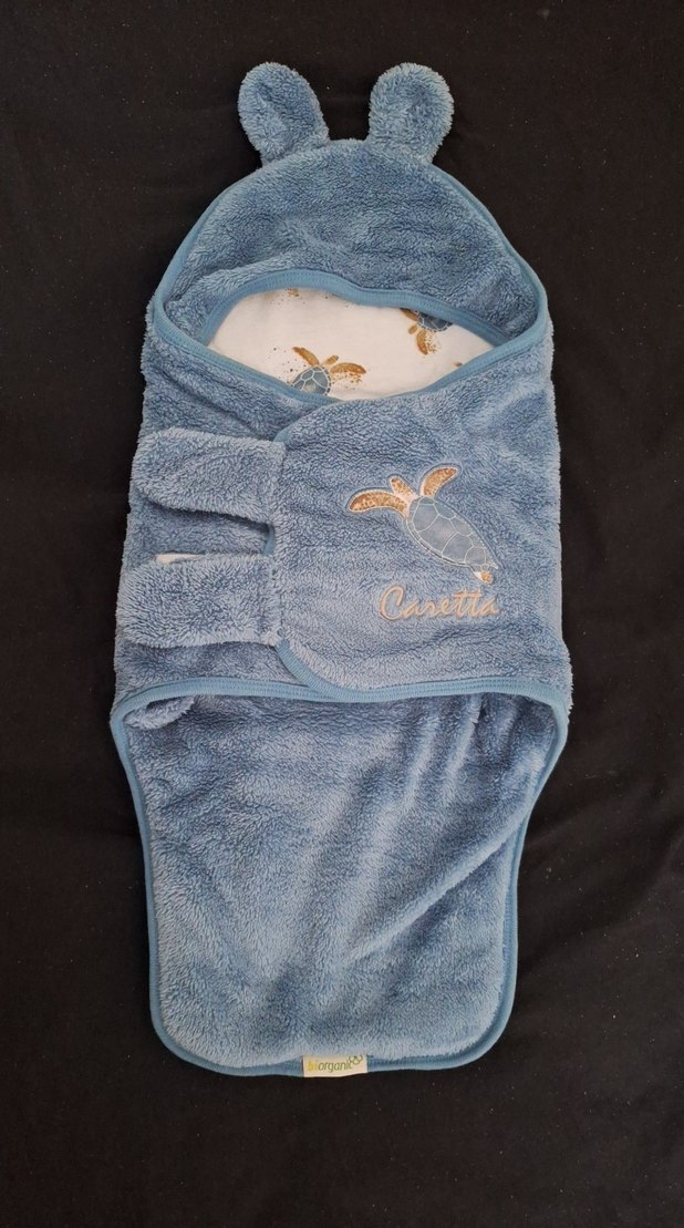 Yumuşak ve sıcak kumaştan yapılmış, kapüşonlu, nakışlı kaplumbağa desenli pastel tonlarda mavi bebek battaniyesi. Çok az kullanıldı çok iyi durumda. Bebeği sarıp sarmalayıp yatırabilirsiniz ya da dışarı çıkarabilirsiniz belini sarmak için ince bir aparat koymuşlar ben kullanmadım çıkarılabiliyor.