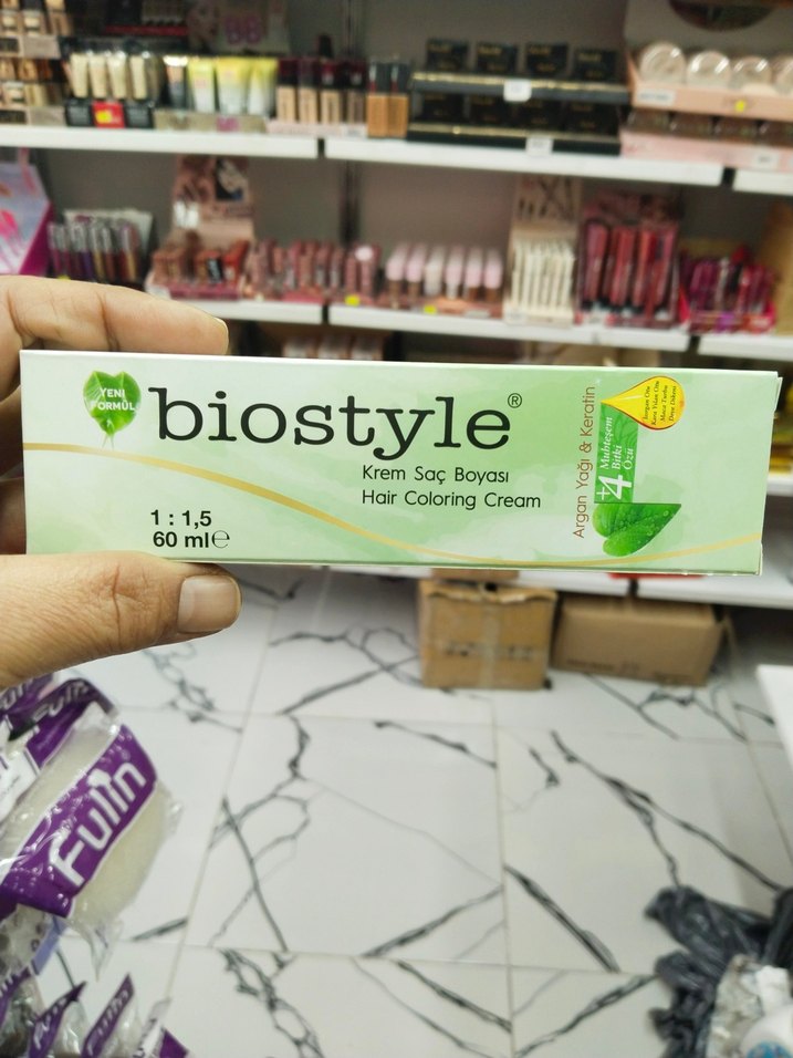 Biostyle 60ml krem saç boyası, 1:1,5 karışım oranıyla. Kayısı yağı ve keratin içerir, saç bakımına destek sağlar.