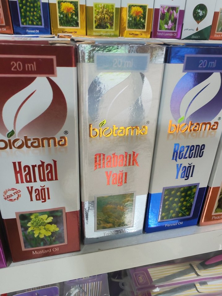 Biotama markasının 20ml'lik hardal yağı, mabaltık yağı ve rezene yağı içeren balsam seti. Her biri ayrı kutuda sunuluyor.