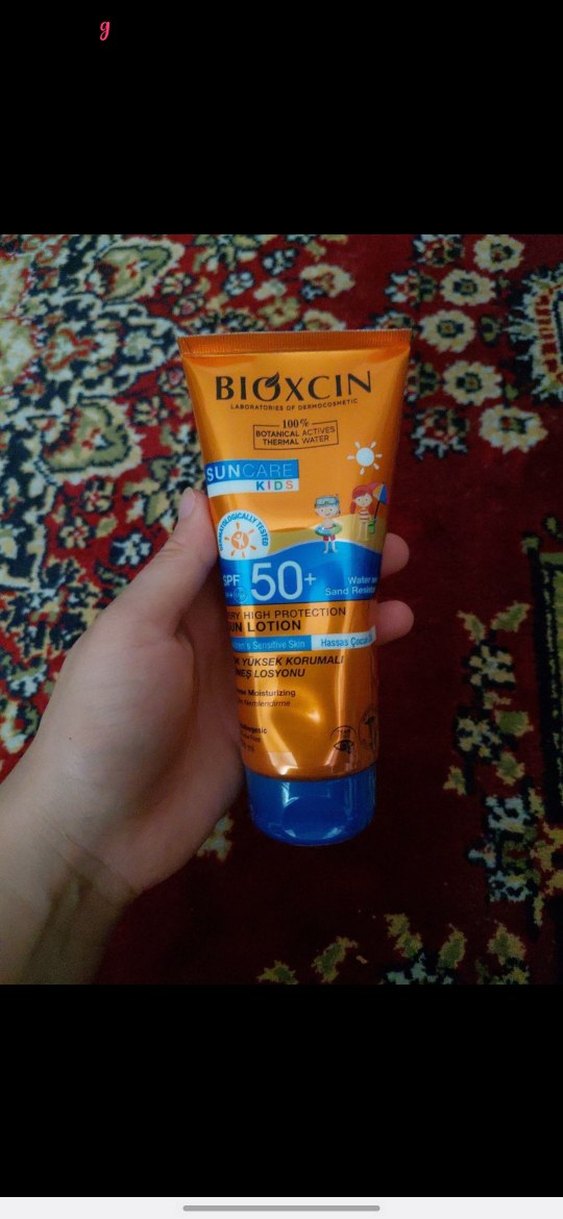 Bioxcin Kids SPF 50+ güneş losyonu, suya ve kuma dayanıklı yüksek koruma sağlar. Bitkisel aktifler ve termal su içerir, hassas ciltler için uygundur. yeni paketi açılmadı.
