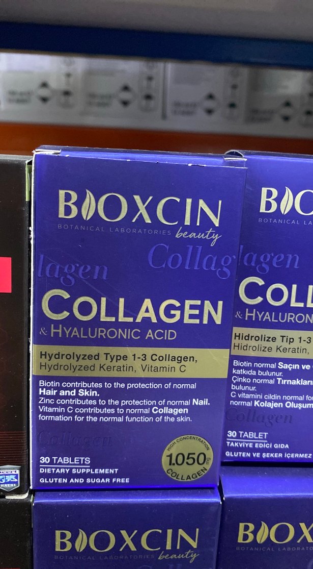 BIOXCIN Collagen ve Hyaluronik Asit, hidrolyze tip 1-3 kollajen, keratin, vitamin C, biotin ve çinko içerir. Saç, cilt, tırnak ve kollajen oluşumunu destekler. Glutensiz ve şekersiz.