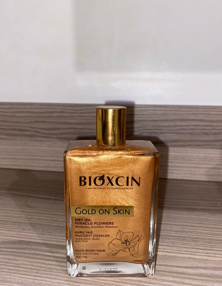 Bioxcin Gold On Skin, yüz, vücut ve saç için altın ışıltılı kuru yağdır. Mucize çiçekler içerir ve parlaklık sağlar. ✨