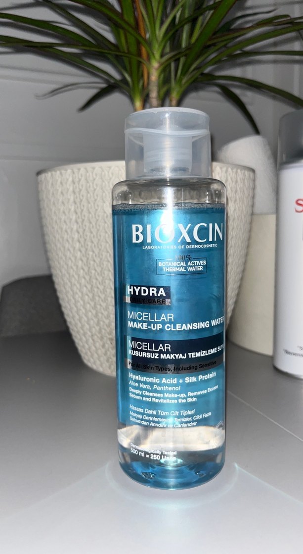 BIOXCIN HYDRA Micellar Makyaj Temizleme Suyu, hyaluronik asit ve ipek proteini ile cildi nemlendirirken makyajı ve kirleri nazikçe temizler. Aloe vera ve panthenol içerir.