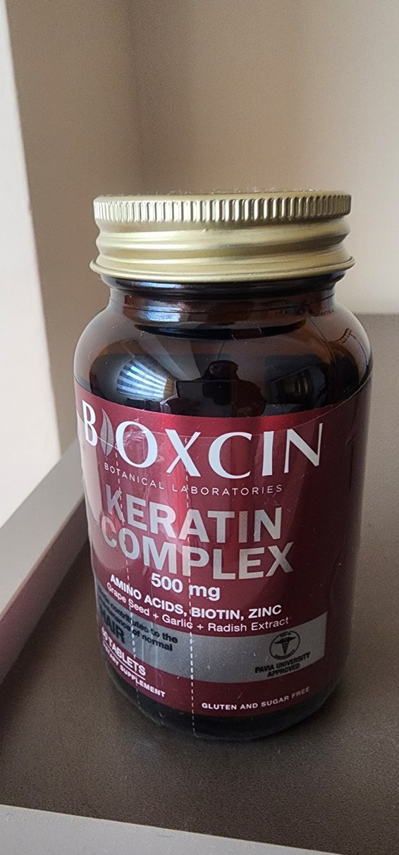 Bioksin Keratin Kompleksi 500mg, amino asitler, biotin ve çinko içerir. Kırmızı biber, sarımsak ve turp özleri ile saç sağlığını destekler. ♂️ sadece 2 adet kullanildi sonra gerek kalmadı..60 tabletli (58 adet var)