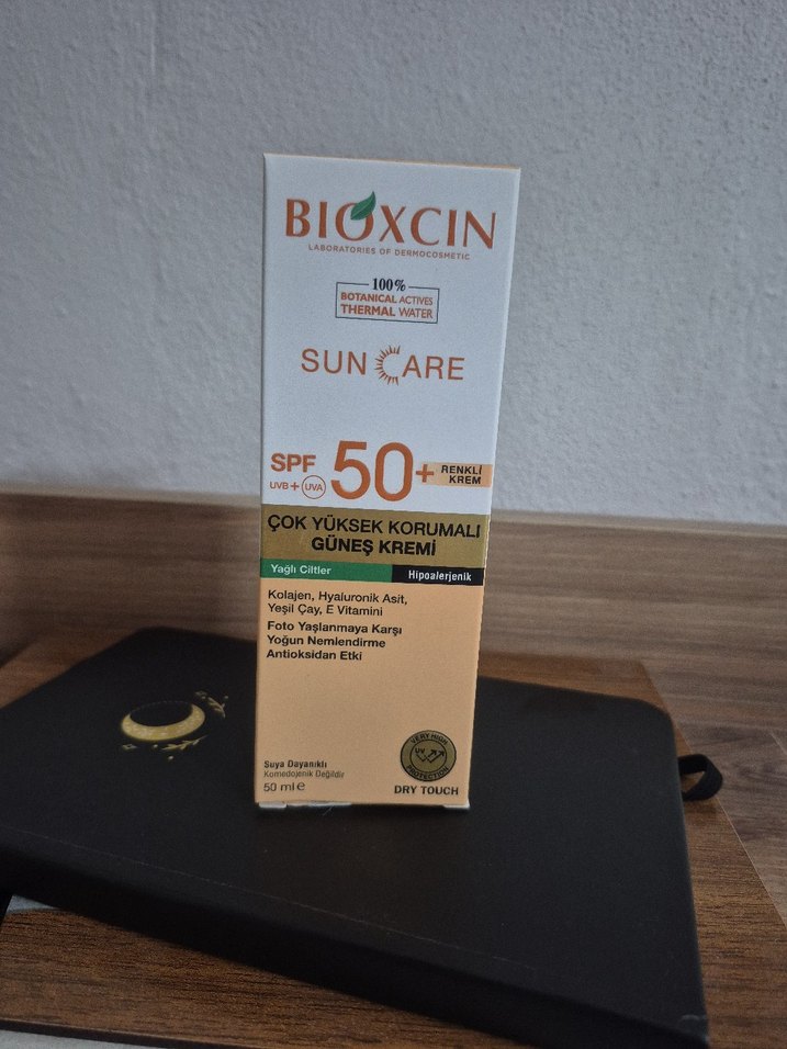 Bioxcin güneş kremi SPF 50 ile çok yüksek koruma sağlar. Yeşil çay, E vitamini ve hyaluronik asit içerir, yoğun nemlendirir ve antioksidan etkilidir. Yağlı ciltlere uygundur, kuru dokunuş sunar.