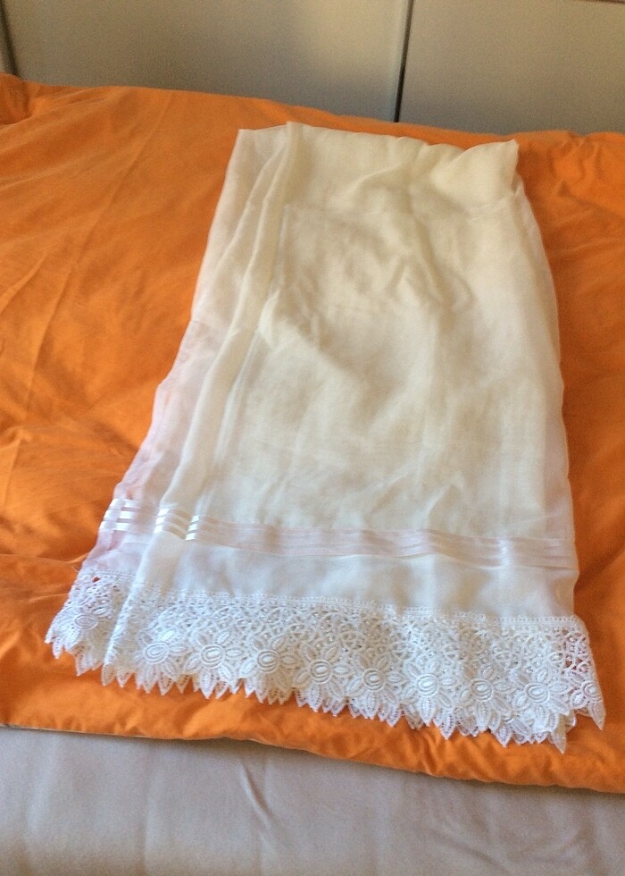Fazlalıktan dolayı satışta etek ucu dantel bıraz üstüne üç sıra kurdele olan pilesiz isterseniz bezebilirsiniz en büzgüsüz halde 320 cm boy 195 cm