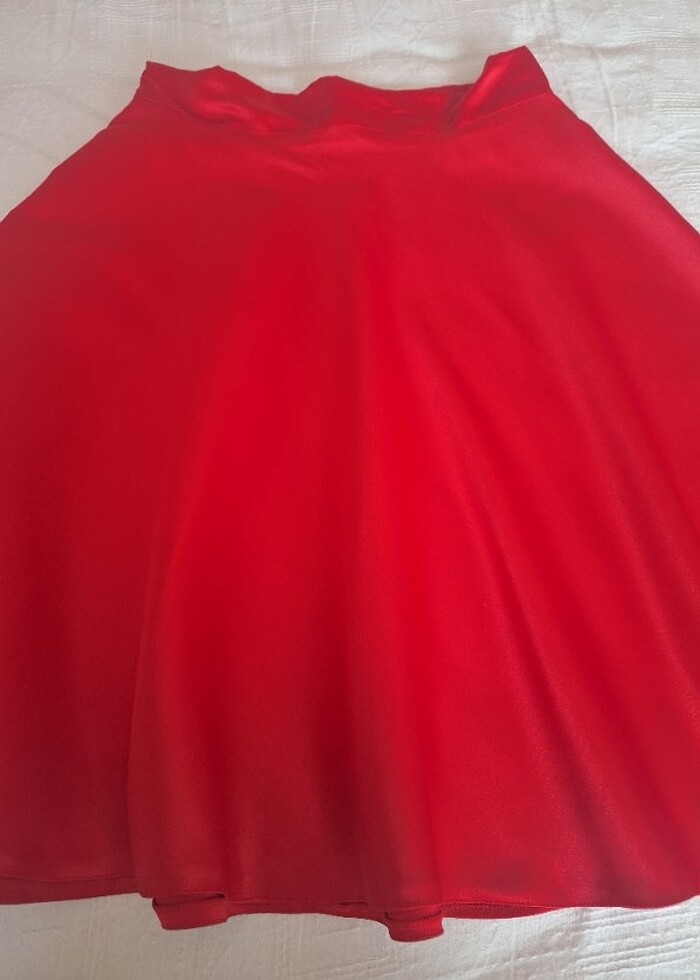 Bir aktivite için dikilmiş saten kloş kırmızı etek.