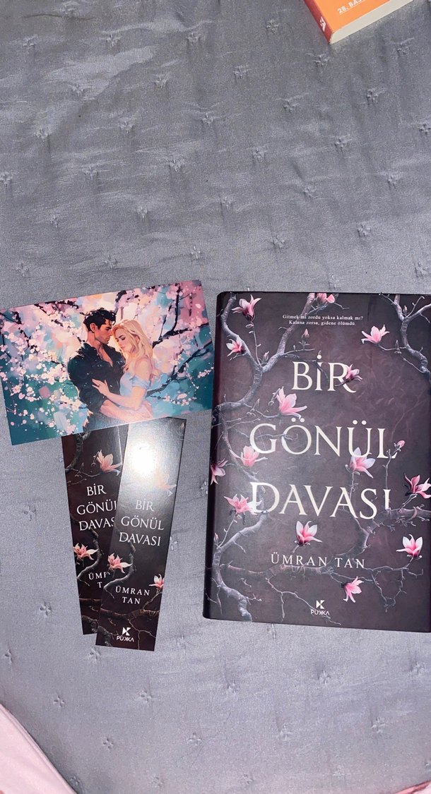 Ümran Tan'ın "Bir Gönül Davası" adlı romanı, kapakta pembe çiçeklerle süslü koyu dallar içerir. Kitapla beraber temalı ayraçlar ve romantik bir kartpostal mevcuttur.