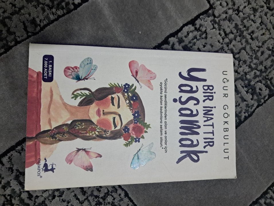 Bir İnatlık Yaşamak adlı sanat kitabı, çiçeklerle süslü bir kadını ve etrafındaki kelebekleri içeren renkli kapağıyla dayanıklılık ve doğa temalarını yansıtıyor.