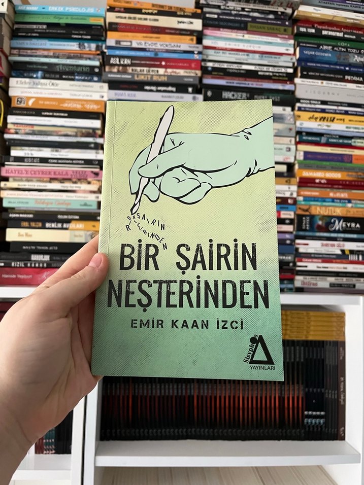Emir Kaan İzci'nin "Bir Şairin Neşterinden" adlı kitabı, şiirsel ifadeyi konu alıyor. Kapakta kalem tutan bir el resmi bulunuyor.