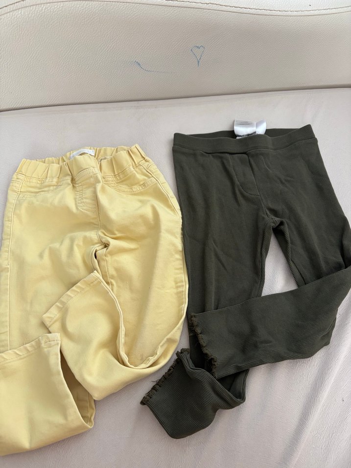 Haki ince fitilli tayt Lc waikiki. Sarı keten pantolon koton marka.Haki olan yepyeni, sarı olanın arka kısmında çok hafif leke var ama belli olmuyor giyince. İkili fiyattır. Bedenleri 3-4 yaş