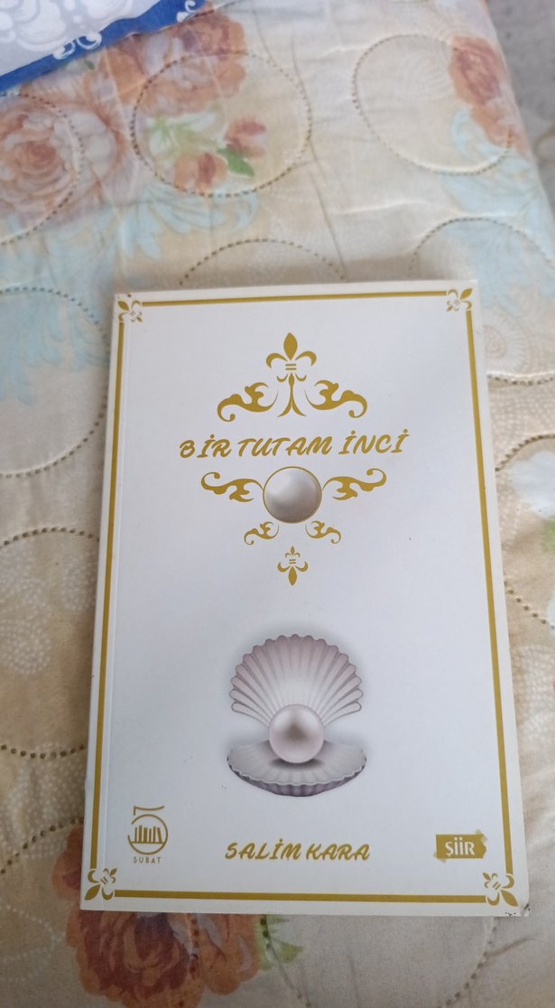 Salim Kara'nın "Bir Tutam İnci" şiir kitabı, inci ve deniz kabuğu görseliyle süslü zarif kapak tasarımına sahiptir.