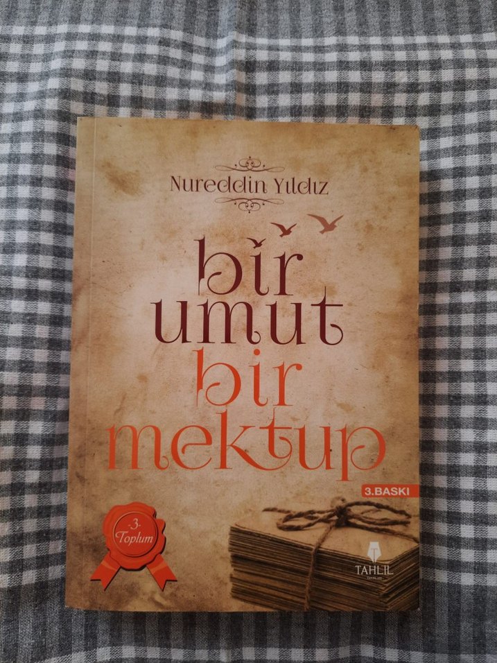 Nureddin Yıldız'ın "Bir Umut Bir Mektup" adlı romanı, 3. baskı, kapakta bağlı mektuplar ve eski tarz tasarım bulunur.