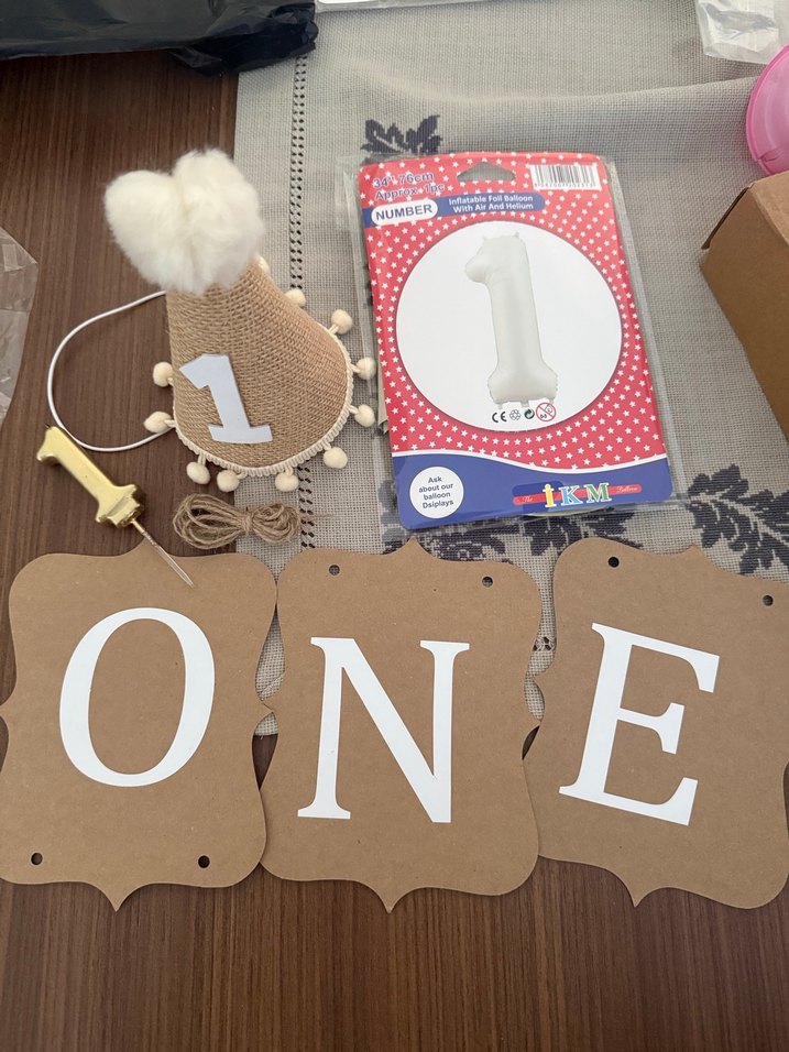 Oğlumun doğum günü için kullanıldı herhangi bir deformesi olmayan bir yaş parti doğum günü malzemeleri satılıktır. Bir adet gold bir yazılı 7 cm mum, bir yazılı bebek parti şapkası, bir yazılı bej folyo balon, one yazılı sert karton kraft baskı ve ipi set halinde verilecektir.