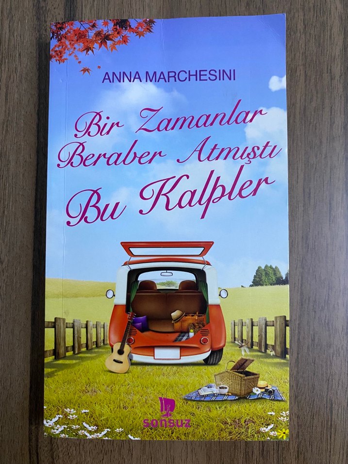 Anna Marchesini'nin 'Bir Zamanlar Beraber Atmıştı Bu Kalpler' adlı romanı. Arka planda araba, gitar ve piknik detaylarıyla huzurlu bir kır atmosferi bulunuyor.