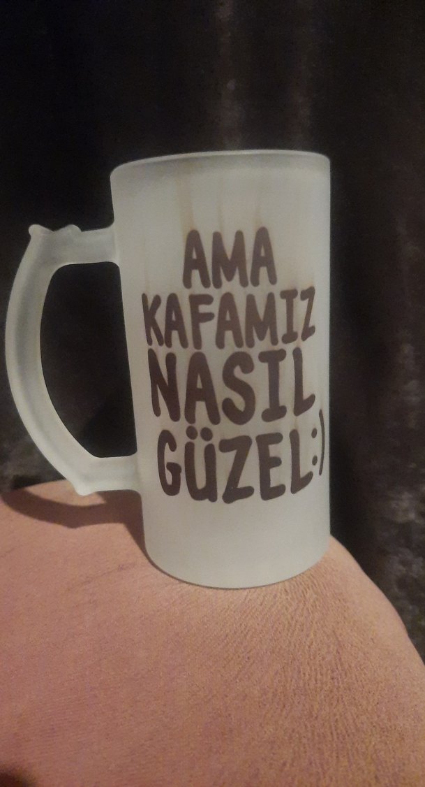 Beyaz camdan yapılmış, üzerinde 'AMA KAFAMIZ NASIL GÜZEL' yazılı, sağlam saplı frosted görünümlü kupa. ☕