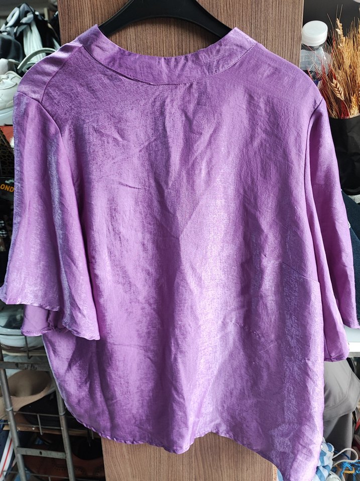 Mor kumaştan, salaş kesim ve V yakalı kadın bluz.