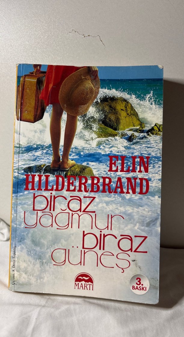Elin Hilderbrand'ın yazdığı, Martı yayınevinin 3. baskısı olan bu romanda, deniz kıyısında valiz ve şapka tutan bir kadının yer aldığı kapak tasarımı bulunuyor. Yağmur ve güneş temaları işleniyor. ☀️