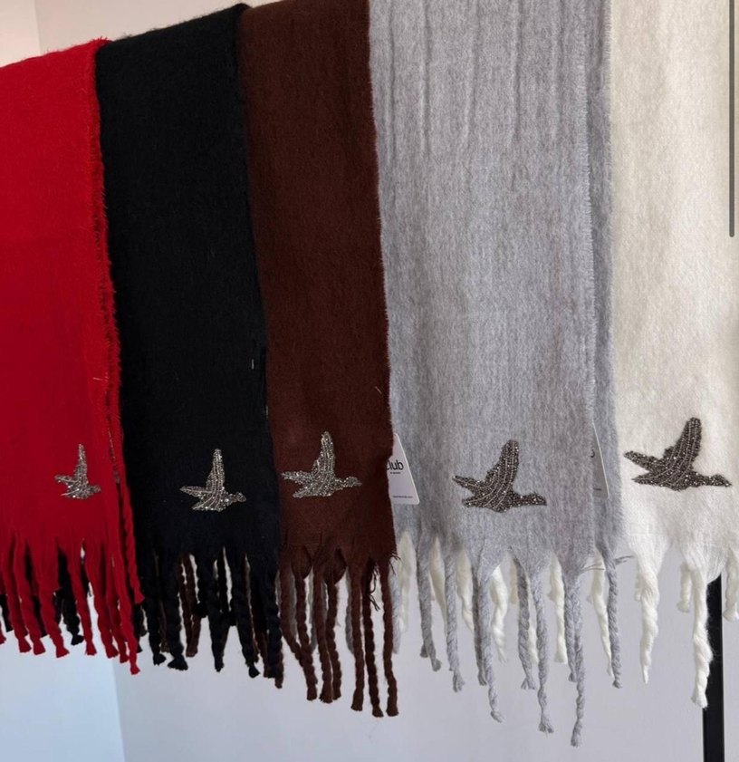 Yumuşak yün kumaştan, püsküllü kenarları renkli kuş işlemeli, rahat bohem tarzda kadın şalı.